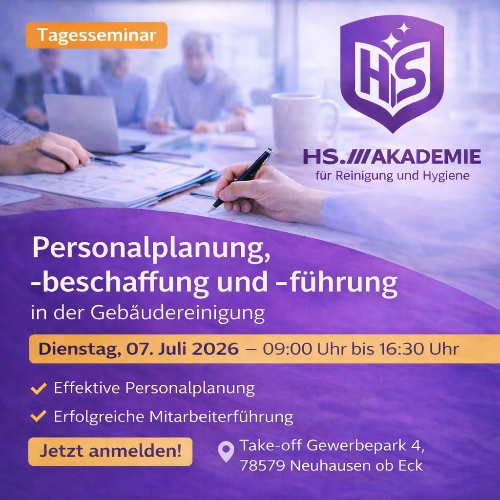 Gerade in der Gebäudereinigung ist eine strukturierte Personalplanung entscheidend für wirtschaftlichen Erfolg, zufriedene Mitarbeiter und eine stabile Betriebsorganisation. In diesem Seminar lernen Sie, wie Sie Personalbedarf richtig ermitteln, Mitarbeiter effizient einsetzen und ein motivierendes Arbeitsumfeld schaffen.